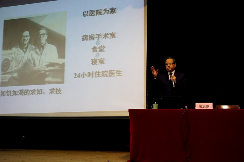 张志愿教授回忆了自己求学和行医历程,介绍了自己潜心钻研所得的成果——口腔颌面·血管畸形研究。同时,他结合病例和自己多年的从医生涯介绍了由他自己首创的“五步法”治疗巨大静脉畸形和“双介入”攻克巨大口腔颌骨动静脉畸形难题治疗技术。张志愿教授图文结合、深入浅出的讲解赢得阵阵掌声。此外,他结合自己的人生经历勉励广大学子要为人谦逊,把握当下,珍惜在校学习的机会。他说:“机会是给有准备的人。一个人必须思想道德品质优秀,刻苦勤奋,坚持努力,耐得住寂寞,学会在漫长的过程中等待,才能守得花开。”