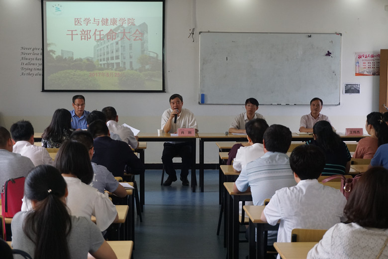肖刚指出,干部任命是根据高等教育事业发展和医学与健康学院发展作出的重要决定,也是学校依据党政领导干部任用条例经过慎重研究后决定的,希望大家统一到学校党委、行政的统一部署上来,以主人翁要求建设医学与健康学院。肖刚充分肯定了医学与健康学院近年来的发展、变化,他认为,医学与健康办学层次不断提升,专业建设富有成效,办学条件明显改善,人才队伍结构得到优化,博士比例超过全校的平均数。他希望新班子到任后,尽快进入工作角色,适应新的学院、新的专业,了解新的同事、学生;加强政治学习、业务学习,虚心向师生学习;按民主集中制要求加强管理,加强合作共事,同舟共济;他希望班子认真履职,务实干事,干净干事,追求奉献,扎根师生,加强开拓创新,抓落实,有担当;他希望班子成员、干部队伍廉洁自律,接受监督,保持工作的连续性,做好十三五规划的落实,一步一个脚印扎扎实实地走出一条新的发展之路、特色之路。