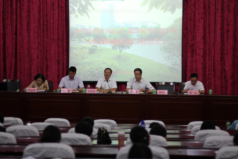 王伟杰指出,医学与健康学院已进入转型升级的重要节点,学校已制定新的发展目标和建设方向,医学与健康学院全体人员要采取积极态度和措施参与学校的建设和发展工作,要始终保持发展定力,做好转型升级,让“转型升级”成为医学与健康学院“十三五”发展期间的座右铭;要认真落实本科教学质量审核评估整改工作,强化学科和专业内涵建设,加快院校整合步伐和师资培养工作;要提升学院和教师社会服务能力,探索社会服务新模式;要进一步统一思想坚定发展的信心,围绕中心任务目标推动重点工作建设;要不忘初心砥砺前行,为实现医学与健康学院跨越发展目标而努力。