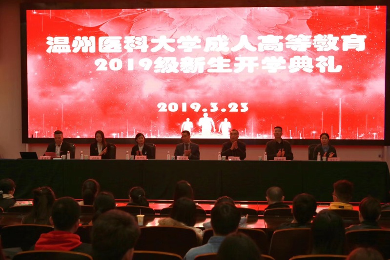 3月23日上午,温医大成人高等教育2019级新生开学典礼在12E第一阶梯教室举行。典礼采取网络直播形式,温医大全省11个教学站与校本部共4505名新生亲历这一时刻。副校长曹建明,校团委、继续教育学院、温州市民康医院相关负责人出席典礼。丽水教学站2019级新生124人及社会服务科全体工作人员参加了开学典礼。