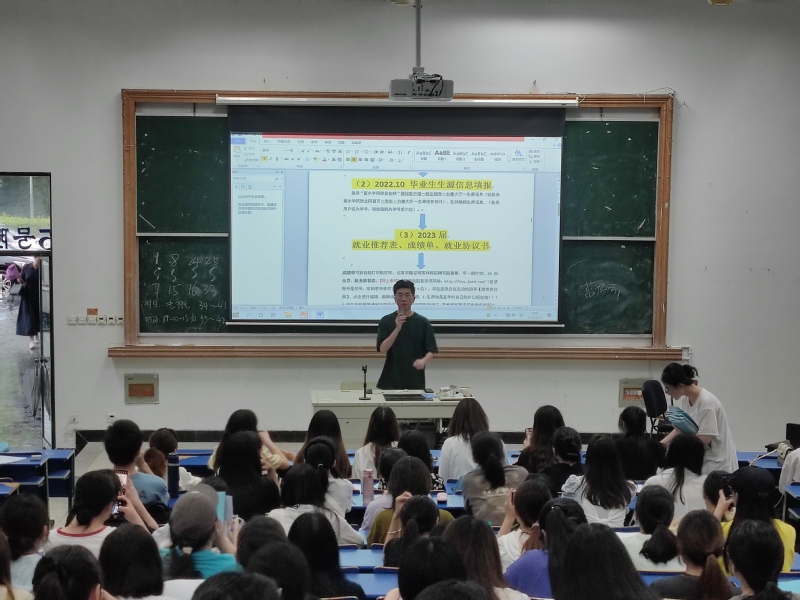 大会伊始,负责就业工作的辅导员为学生们分析当前就业形势,强调毕业生要为自己科学定位,明确目标,提前做好准备。大会主要讲解毕业流程和就业材料申请,为在座的毕业生们答疑解惑。同时指出,在外出实习阶段,学生要注意保护个人生命财产安全,谨防各类诈骗。会上,就业辅导员老师还特别介绍丽水市就业创业人才政策,鼓励大家积极了解政策动向,为丽水建设贡献青年力量。