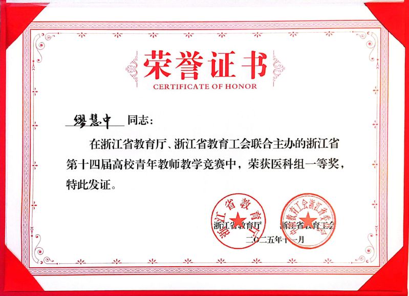11月16日,浙江省第十四届高校青年教师教学竞赛在宁波大学圆满落幕。我院缪慧中老师获医科组一等奖。