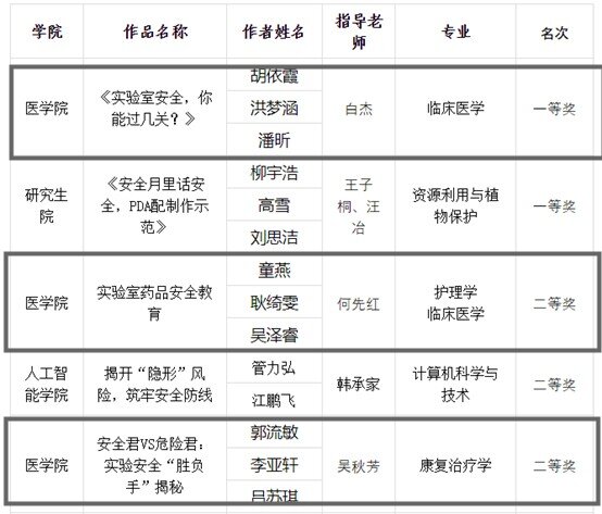 全校参加本次大赛的作品近67项,其中我院白杰老师指导的微视频作品《实验室安全,你能过几关》获得一等奖,何先红老师指导的微视频作品《实验室药品安全教育》和吴秋芳老师指导的微视频作品《安全君VS危险君:实验安全“胜负手”揭秘》获得二等奖,这些作品紧扣实验室安全规范、立意深刻、手法新颖、语言精湛,兼具思想性、艺术性与传播力,体现了我院学子扎实的专业技能与强烈的安全责任感。此次大赛佳绩的取得,是我院长期以来注重实验室安全,培养学生实践创新能力与专业教学深度融合的体现。我院将继续鼓励师生参加此类比赛,不断提升不断提升综合素质,为营造校园安全文化氛围、服务学校育人事业贡献医学院力量。