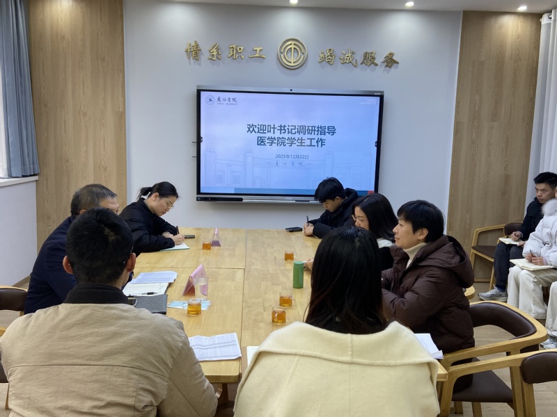 12月22日下午,校党委副书记叶华松带队调研指导医学院学生工作,院党委书记吴华岳、党委副书记张凯波、副院长许丽娟和全体辅导员参加。